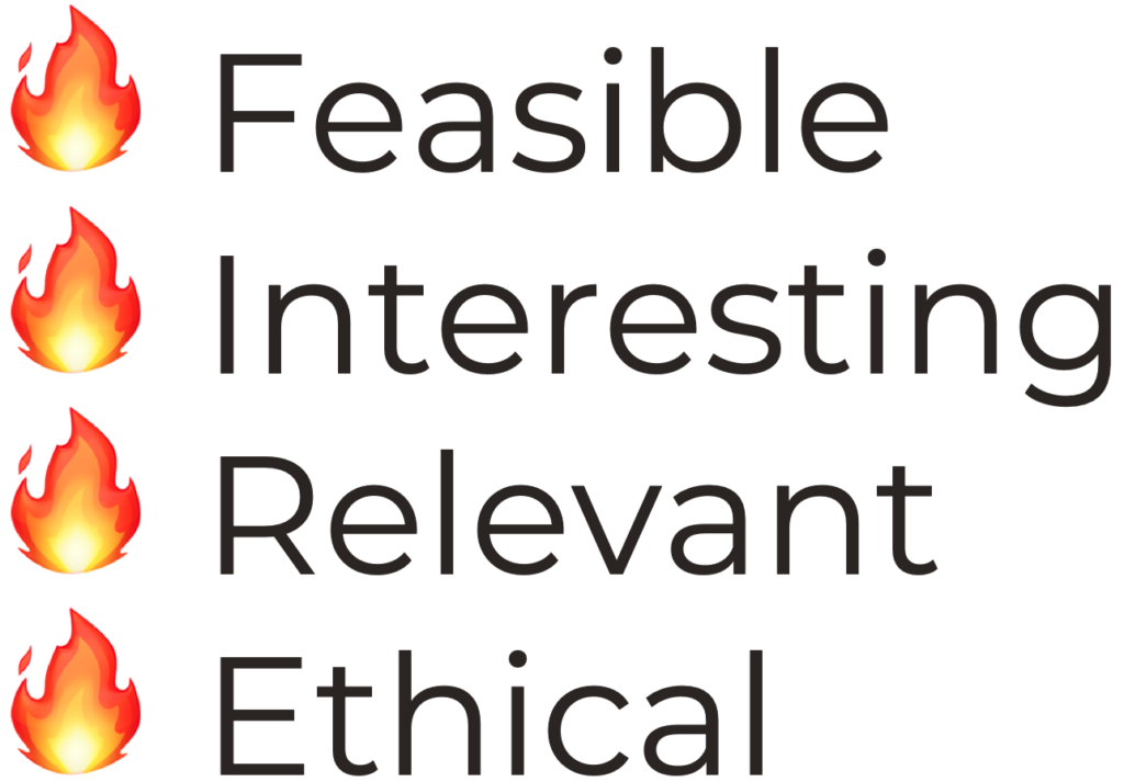 Before you get too far, you need to develop your research question. What, exactly, are you hoping to learn with your project? What methods will you use to answer this question? Check out our Developing a Research Question course for help with this. Once you have your research question, use the FIRE framework to assess whether you should go through with the project as is or if you should make any changes.